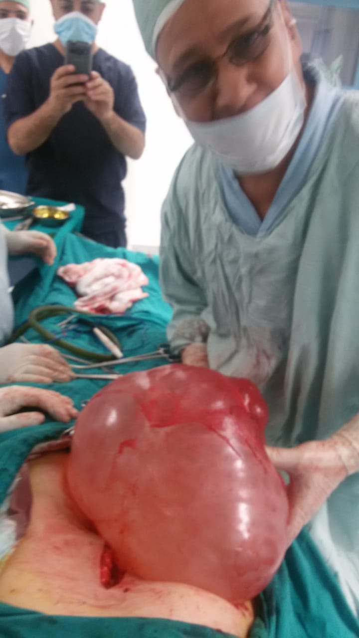 واكد الدكتور ممدوح سامى كيرلس استشارى الجراحة العامة وجراحة الاورام بمستشفى المعلمين وقائد الفريق الطبى الذى اجرى الجراحة ان المريضة حضرت الى مستشفى المعلمين وكانت تعانى من تضخم كبير بمنطقة الحوض والبطن وعدم القدرة على التنفس وعلى الفور تم ادخالها العناية المركزة لصعوبة حالتها